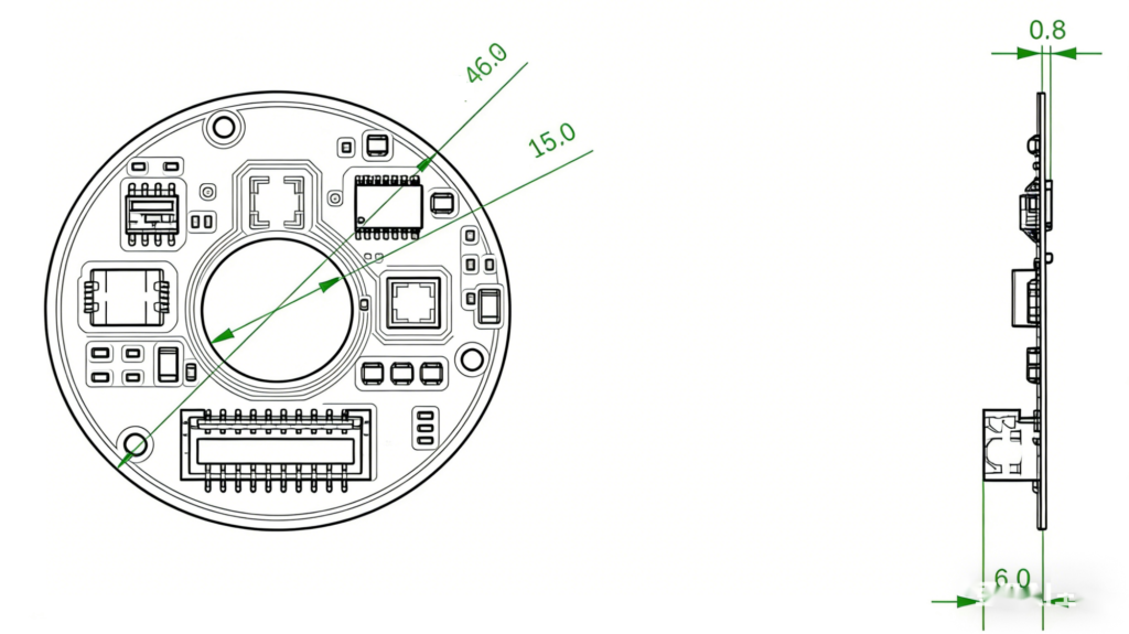 The key advantage lies in the Off-Axis design. Unlike traditional coaxial solutions where the chip must be placed directly above the rotating shaft’s center, the off-axis design allows the chip to sense a ring magnet located on the side of the shaft. This makes it inherently suitable for Hollow Shaft encoders, offering significant mechanical flexibility for motor design, simplifying installation, and saving valuable space .