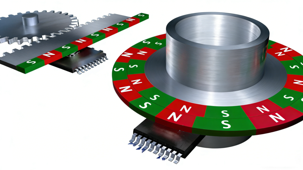 In linear position sensing, the chip moves along a magnetic scale with alternating polarities to form a closed-loop measurement system.