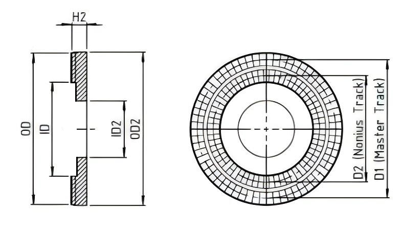 | Number of pole pairs on master track | Number of pole pairs on Nonius track | ID2 | 0D2 | Diameter of master track | Diameter of Nonius track | Pole width of master track | Pole width of Nonius track |